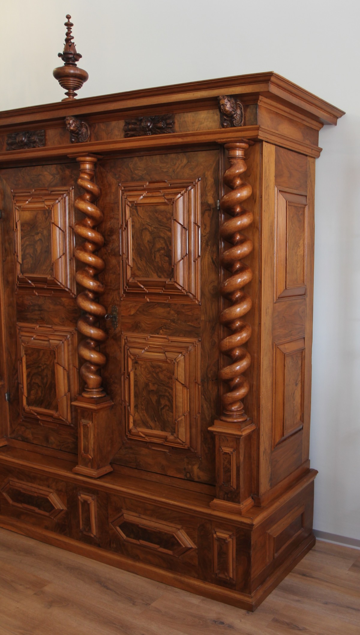 Elle est ornée de trois colonnes torses traitées en double symétrie [de part et d'autre de l'armoire ou de part et d'autre de la porte de droite], en noyer massif sculpté à la main, chacune reposant sur une haute console panneautée et sommée d'un chapiteau toscan; les deux colonnes latérales sont chevillées chacune à un corps d'armoire, alors que la colonne centrale est chevillée à la porte de droite.