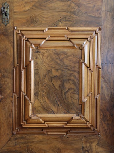 Si le corps de l'armoire est plaqué en noyer de fil, la façade des portes et du socle, ainsi que la table de tous les panneaux (portes, côtés et socle), sont ornés d'une marqueterie de placage de noyer ramageux; l'ébéniste a sélectionné ses plaques avec attention et chantourné ses découpes selon les motifs du bois afin d'obtenir le rendu homogène d'une seule feuille de placage - alors impossible à débiter dans ces dimensions.
