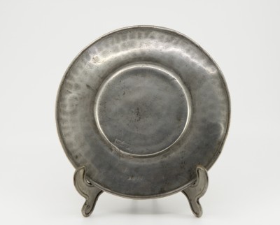 Cette charmante petite assiette (qui devait être à l'origine un présentoir de channe) est due au célèbre Etienne Delafontaine (1610-1683), issu d'une famille de potiers d'étain installée à Genève depuis le milieu du XVIe siècle. Son joli poinçon quadrilobé porte au centre la date de 1609, qui est celle de l'ordonnance de modification de l'alliage, porté à 17 livres de plomb pour 100 livres d'étain [Genava 1942, p. 450]. L'ordonnance prévoyait qu'on envoie à la fonte tous les ouvrages de l'ancienne ordonnance de 1557 (c'est également l'ordonnance de 1557 qui exige que les potiers appliquent sur leurs produits la lettre F pour "étain fin").