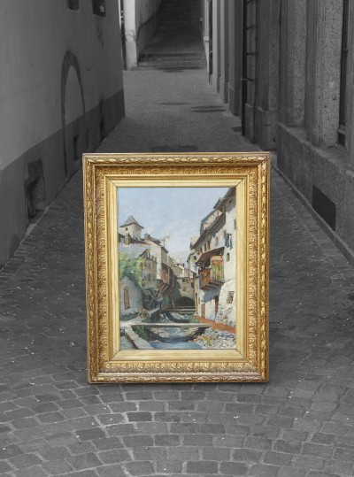 Non signé, notre tableau est une copie fidèle (jusque dans les dimensions du châssis) de l'oeuvre de Jeanmaire intitulée Vieille rue à Sion, Valais, quartier des Tanneurs (1889) et exposée au Musée d'Art et d'Histoire de Neuchâtel.