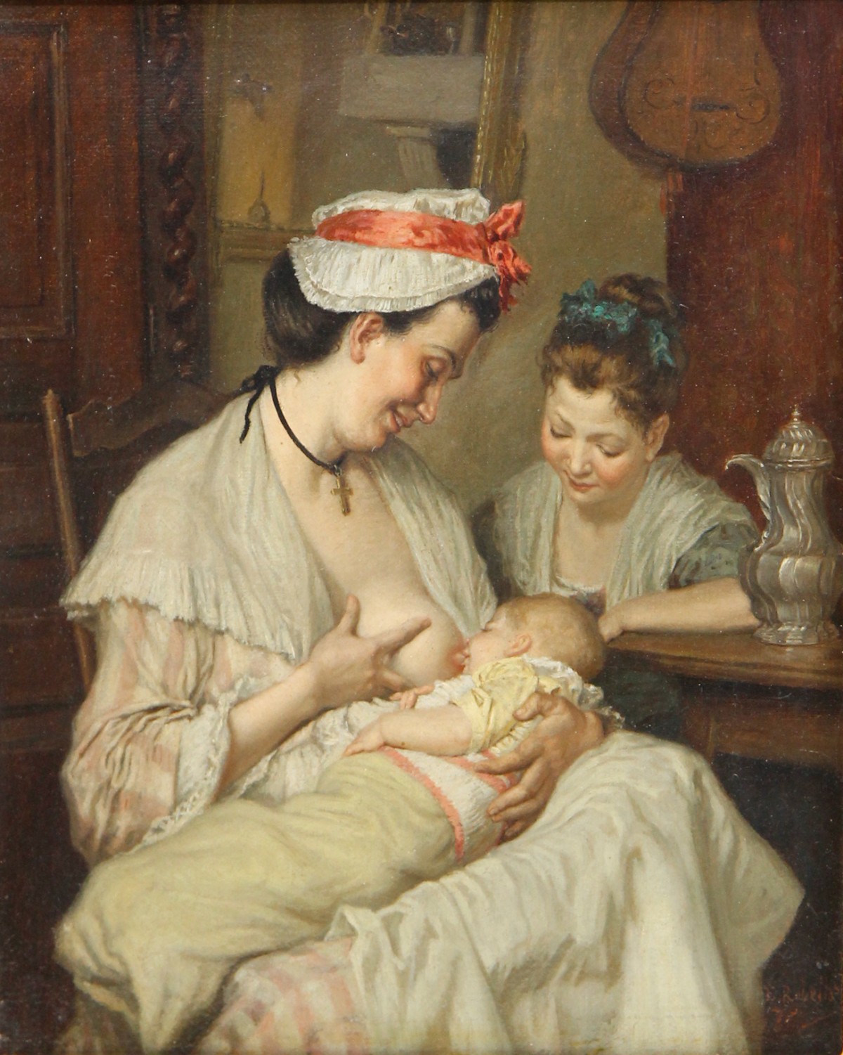 Robellaz aimait bien les scènes historiques un peu troubadouresques, avec mousquetaires, lansquenets et jolies marquises. On le préfère personnellement dans le rendu de scènes intimistes de son temps, comme dans cette très charmante maternité. On retrouve le même modèle avec sa coiffe à ruban rouge sur un autre tableau de Robellaz, intitulé "La Repasseuse" et passé en vente à Genève le 22 juin 2011.