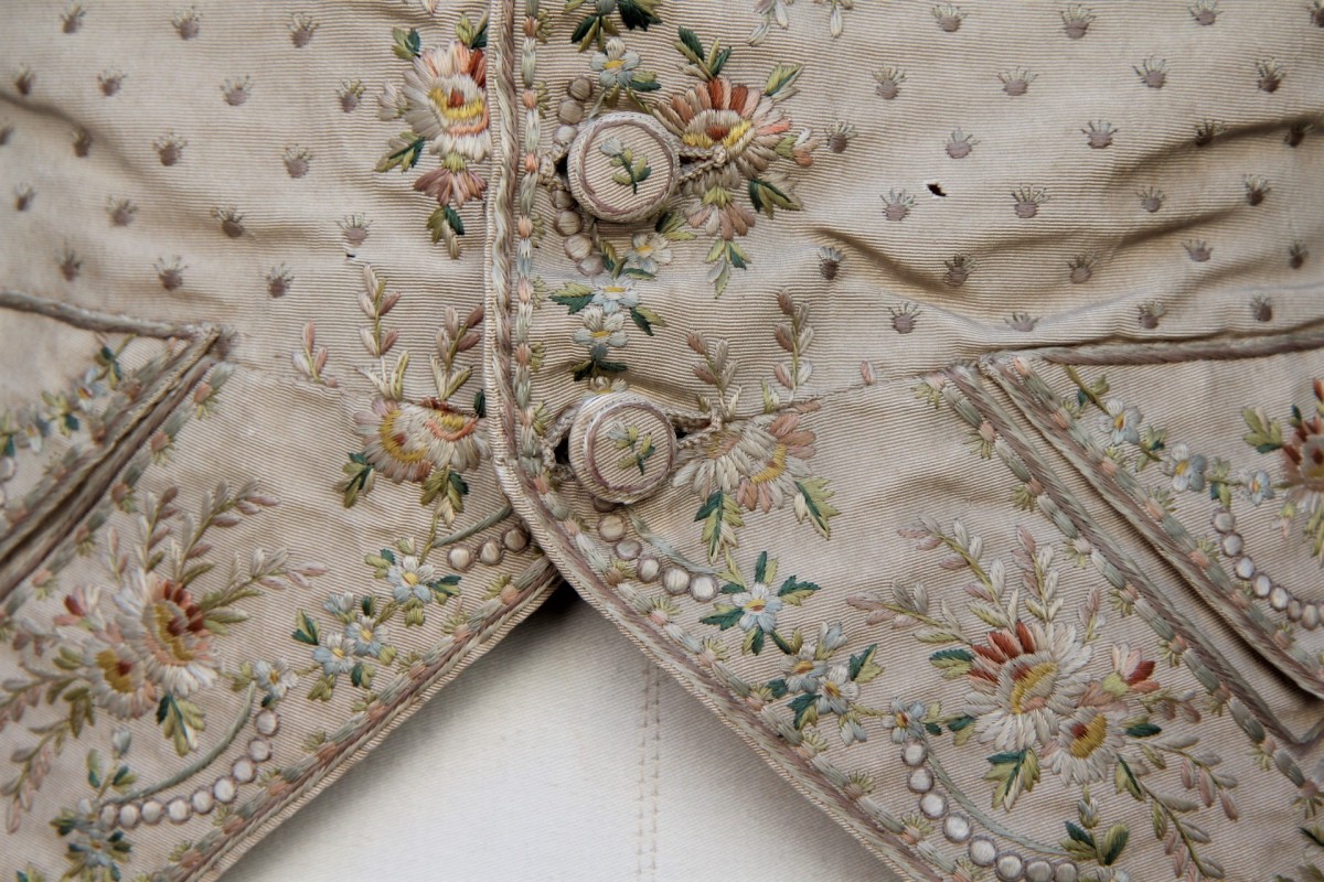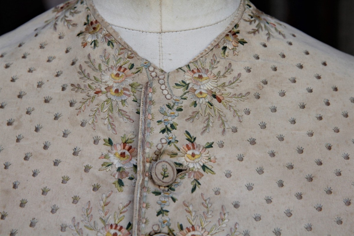 Complet de ses 11 boutons de bois recouverts de soie brodée