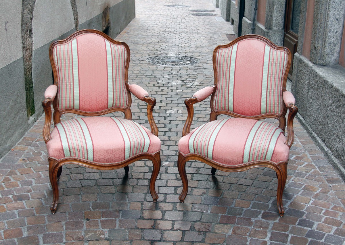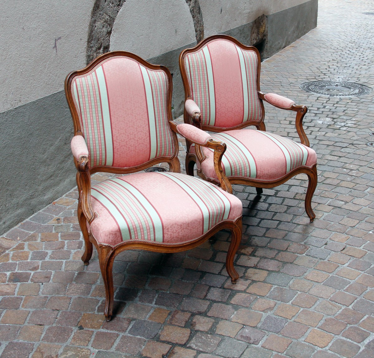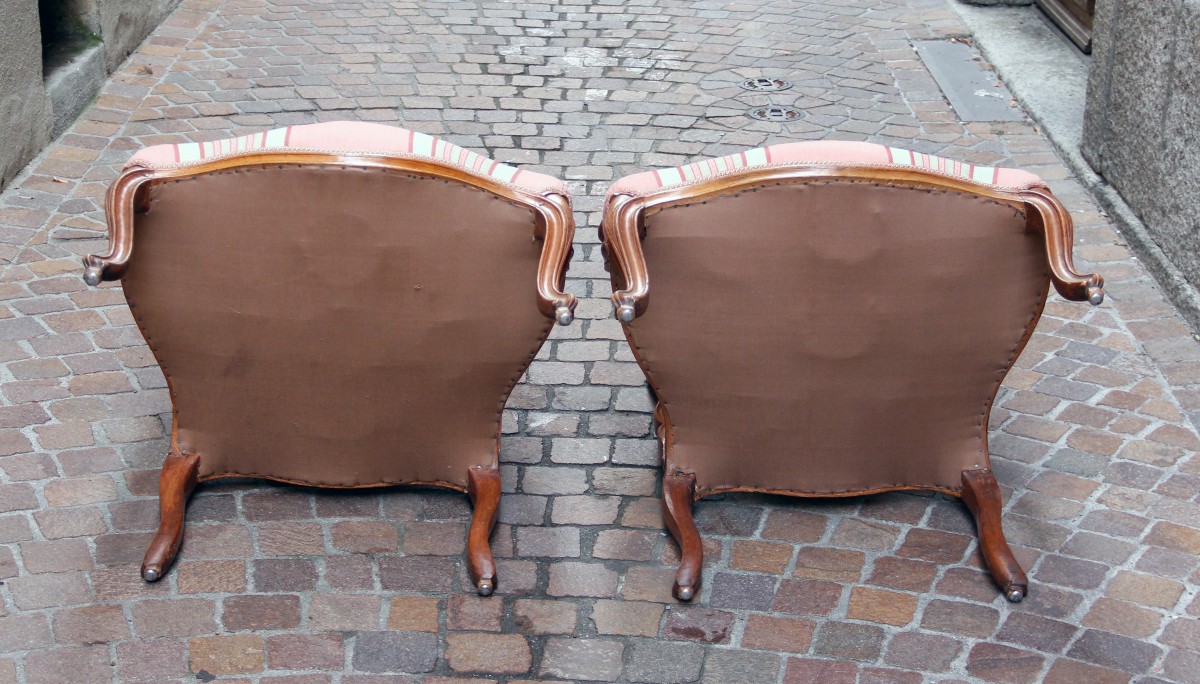 Présentés dans leur état de découverte, garnis à ressorts et recouverts au XXe d'une soie imprimée.