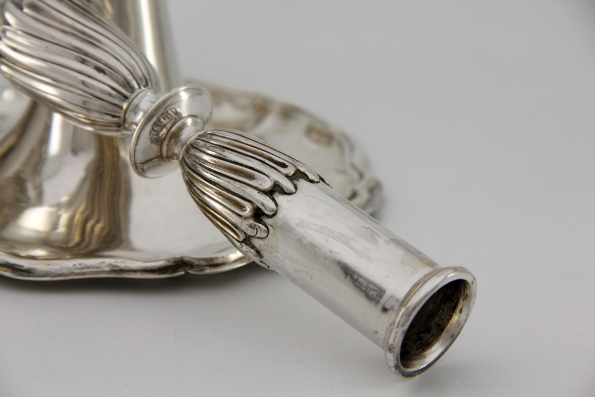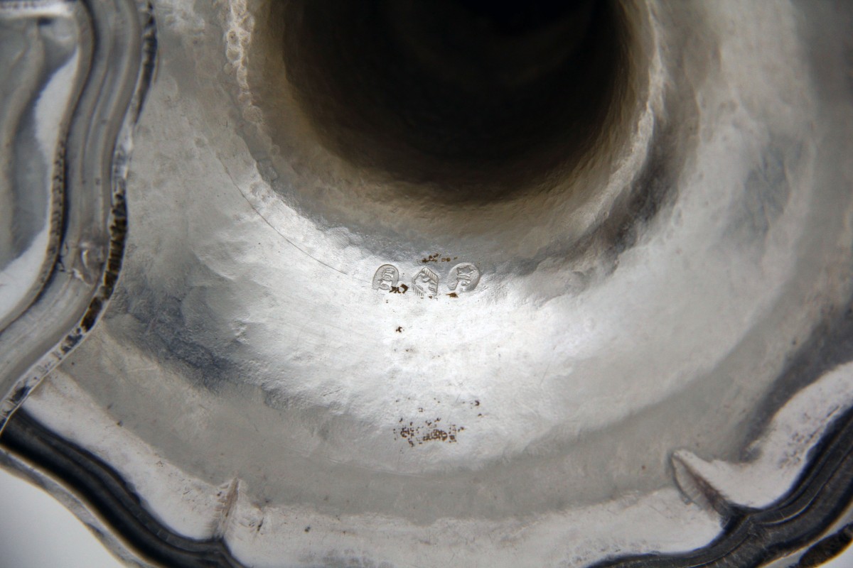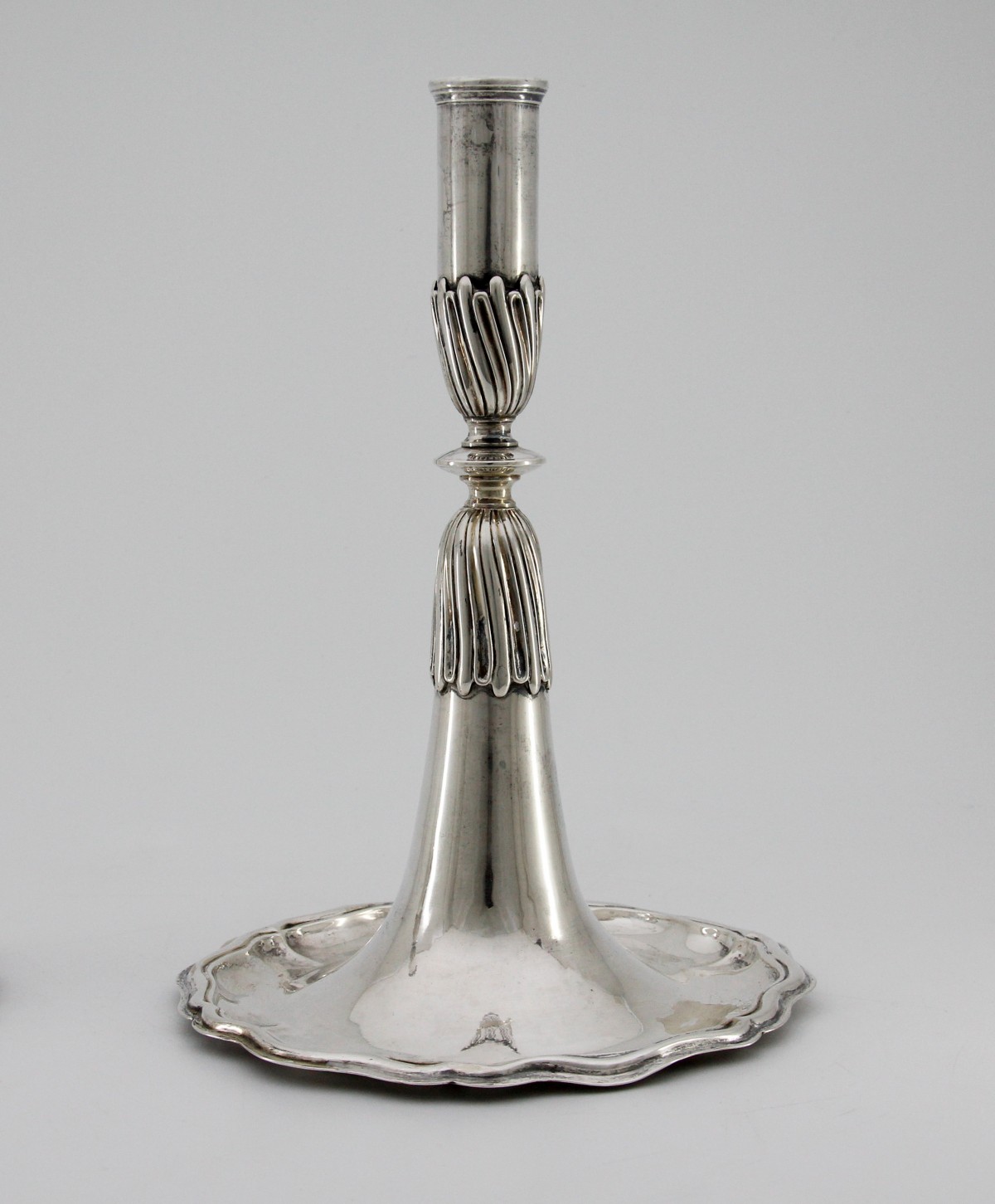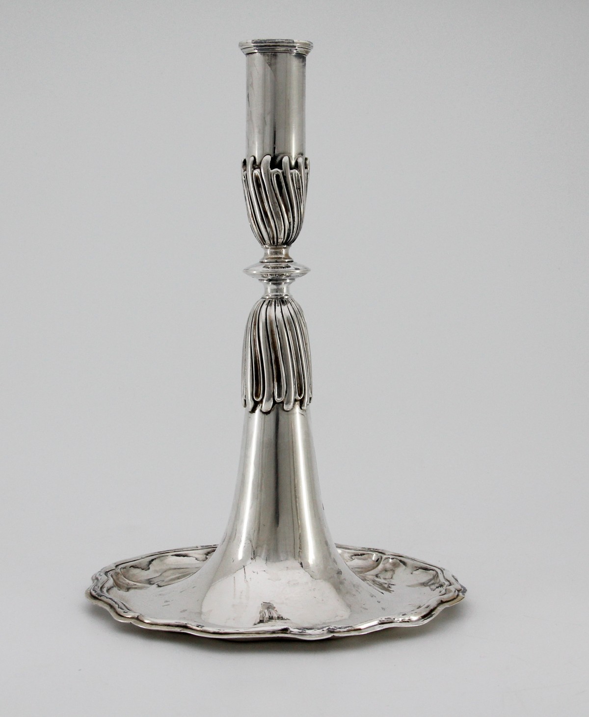 Sans bobèches (si la plupart des flambeaux trompette publiés sont munis de bobèches, on ne sait que très rarement si celles-ci sont contemporaines des flambeaux ou non. D'après ce que nous avons pu constater, de nombreuses bobèches ne sont pas poinçonnées ou, si elles sont bien du XVIIIe, viennent souvent d'un autre atelier. D'ailleurs, la forme très évasée et en légère cuvette du pied des flambeaux trompette se prête parfaitement à une utilisation sans bobèche, comme c'était très souvent le cas au XVIIIe siècle. Voir par exemple le tableau Le Canard blanc (1753) de Jean-Baptiste Oudry, reproduit dans Helft 1980, p.370, où le très beau flambeau d'Antoine Bailly est dépourvu de bobèche).