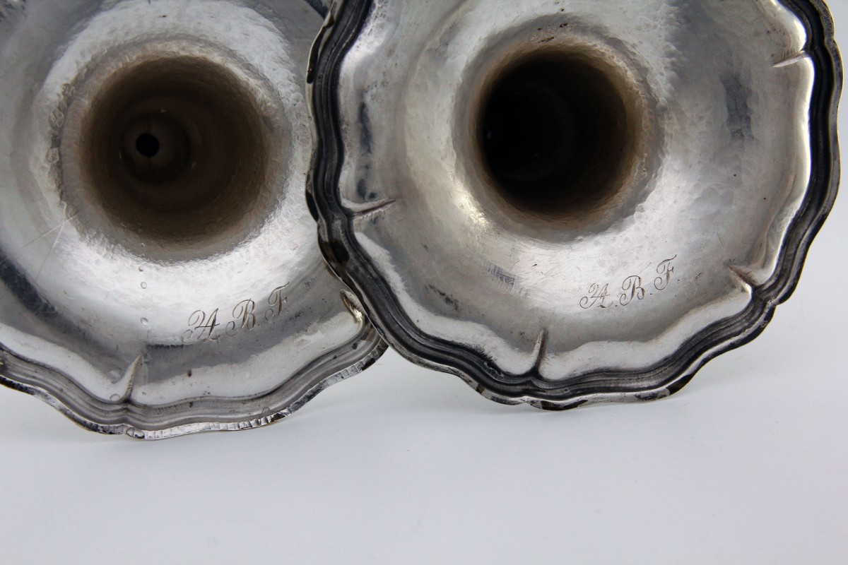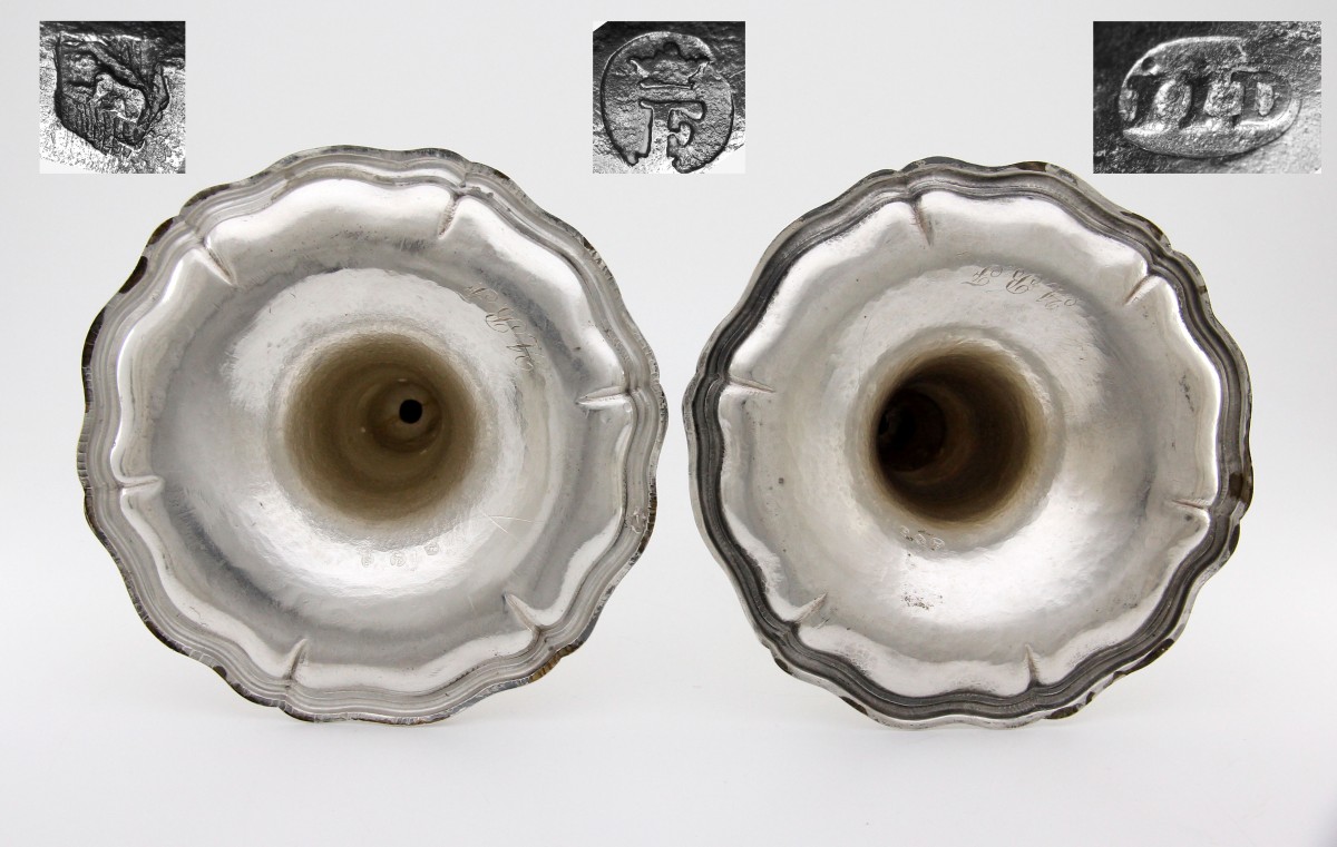 Ces flambeaux constituent une fausse paire [0,5 mm et 25 g de différence de hauteur et de poids; le plus grand étant vraisemblablement légèrement plus ancien (vers 1760), si l'on en juge par le poinçon de ville]; cependant, la marque de famille gravée sous les deux flambeaux [ABF] indique un appariement déjà ancien (fin XIXe - début XXe), aussi les proposons-nous ensemble.