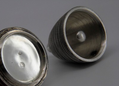 La base porte les poinçons du maître orfèvre (IK) et de la ville de Vienne pour l'argent 13 Lot; si les chiffres de gauche sont illisibles, on devine à droite un 8 et un 5, très vraisemblablement pour 1865 si l'on se réfère à la datation de la petite ruche-tirelire de Dorotheum [1864], au design très similaire.