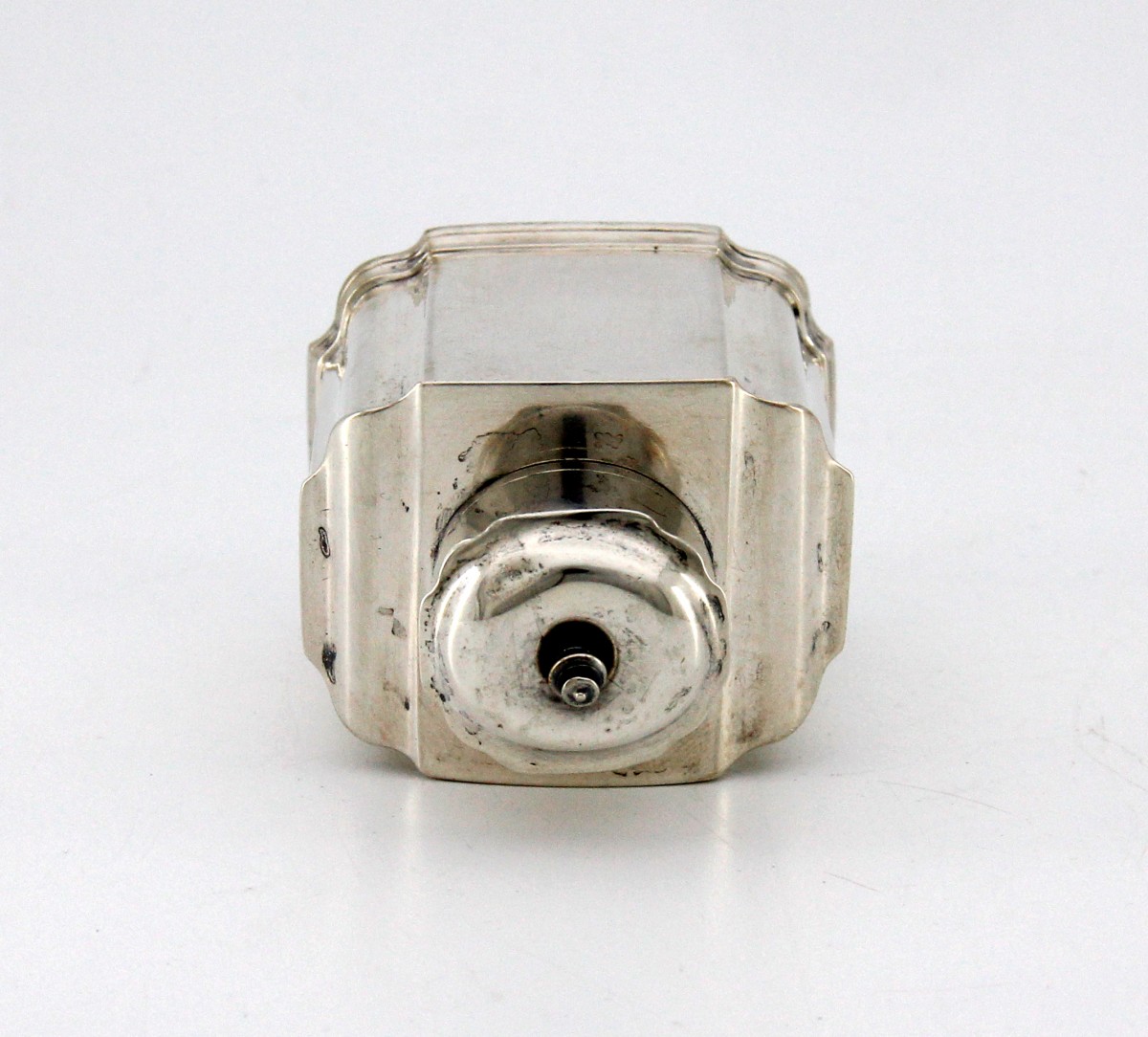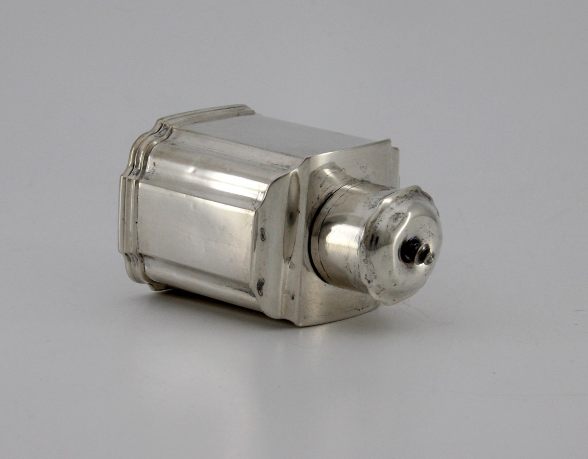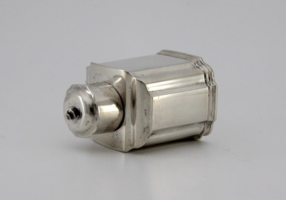 Très belle forme aux angles chantournés et à sommet convexe. Bouchon bien hermétique à prise en bouton (jeu dans le rivetage).