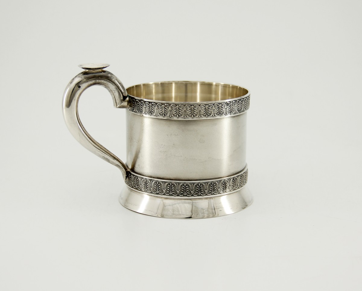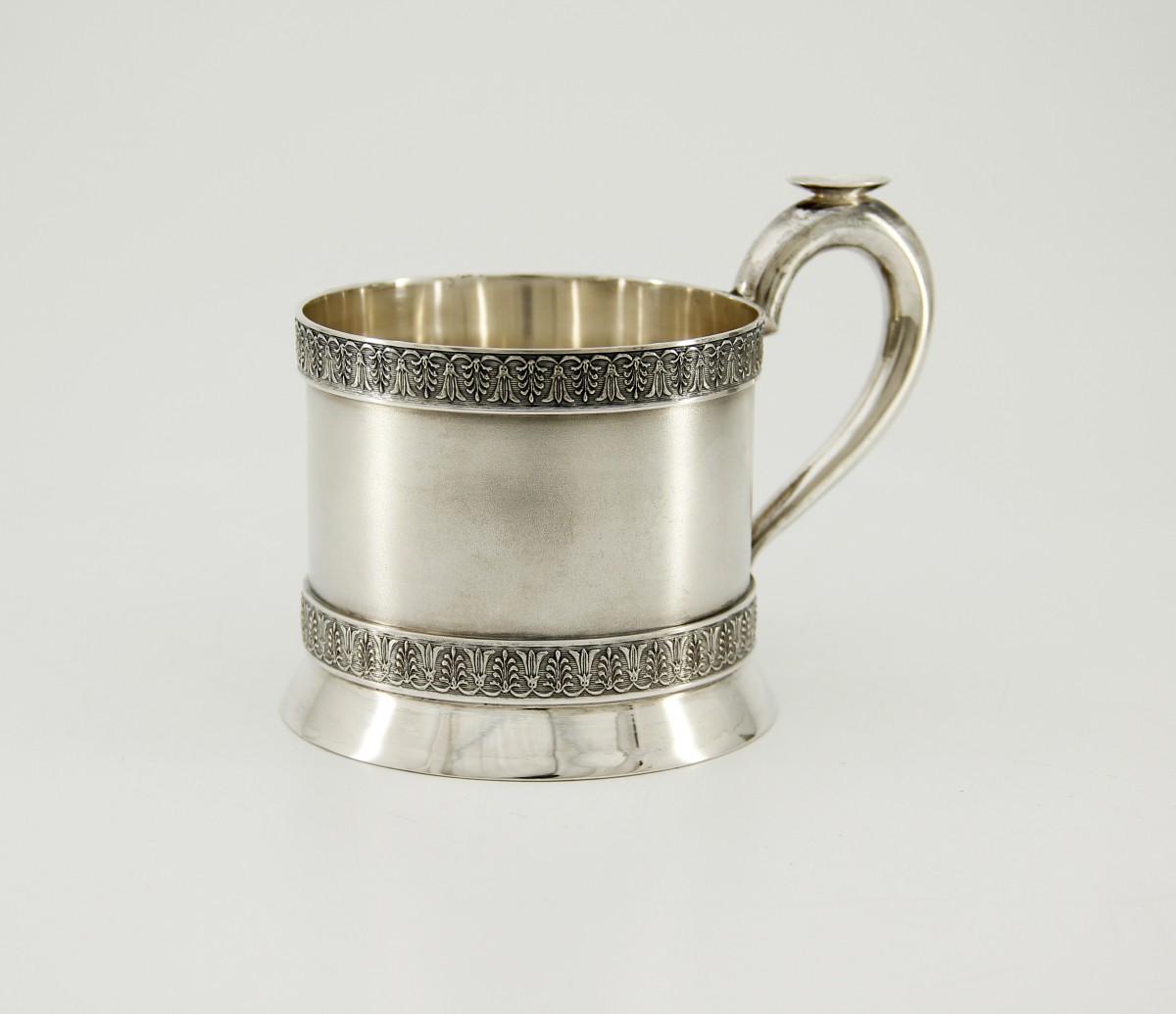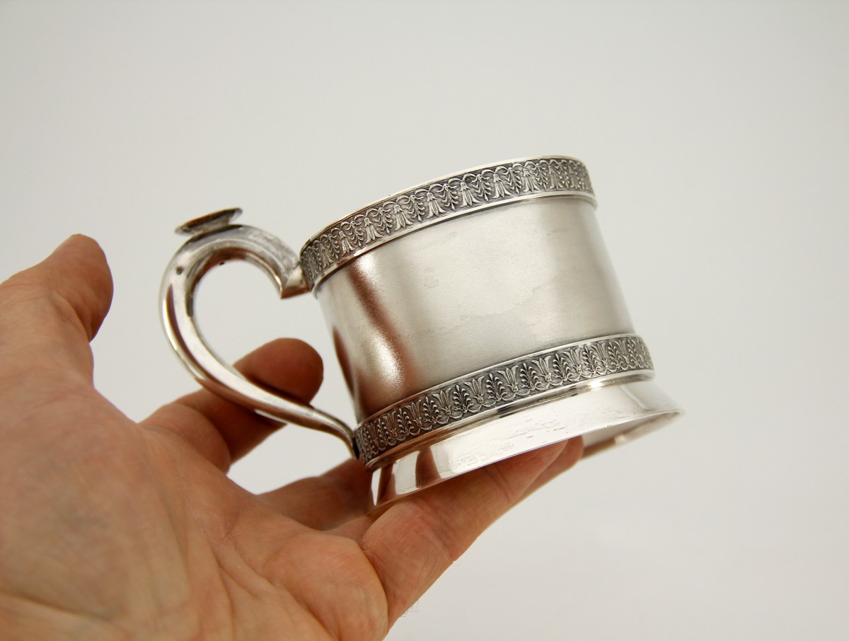 Ce porte-verre très épuré, sur pied tronconique, est simplement enrichi de deux frises de palmettes de style Empire à la française. Le corps est très finement amati, créant un contraste subtil avec l'argent poli du pied et de l'anse.