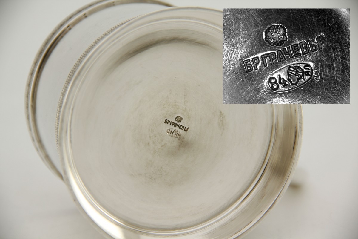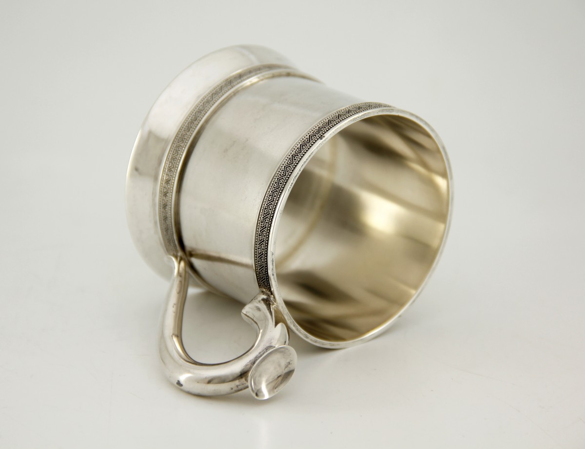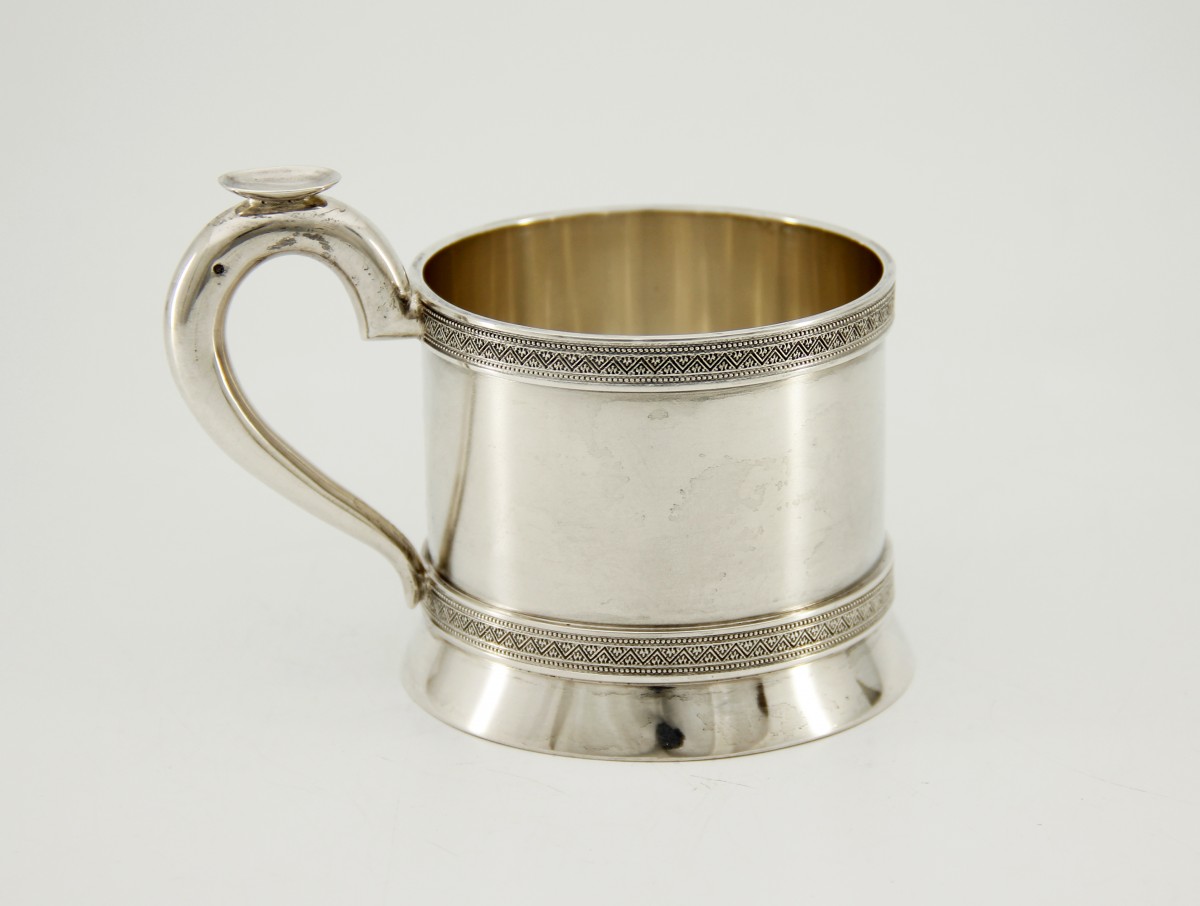 Ce porte-verre très épuré, sur pied tronconique, est simplement enrichi de deux frises de triangles. Le corps est très finement amati, créant un contraste subtil avec l'argent poli du pied et de l'anse.