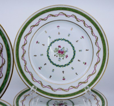 Quelques pièces avec une légère usure du décor (plat rond creux, trois assiettes à dîner).